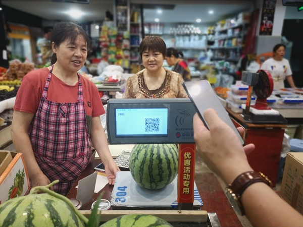 记者发现,在全部的150余户摊位上,都摆放着一台智能电子秤,收款方式涵盖微信、支付宝、现金等。购买的商品经过电子秤后,其价格等信息会显示在显示屏幕上,屏幕随即产生一个支付二维码,顾客在完成支付后都能拿到一张有溯源二维码的小票,手机一扫,便可了解经营户和产品的相关信息。