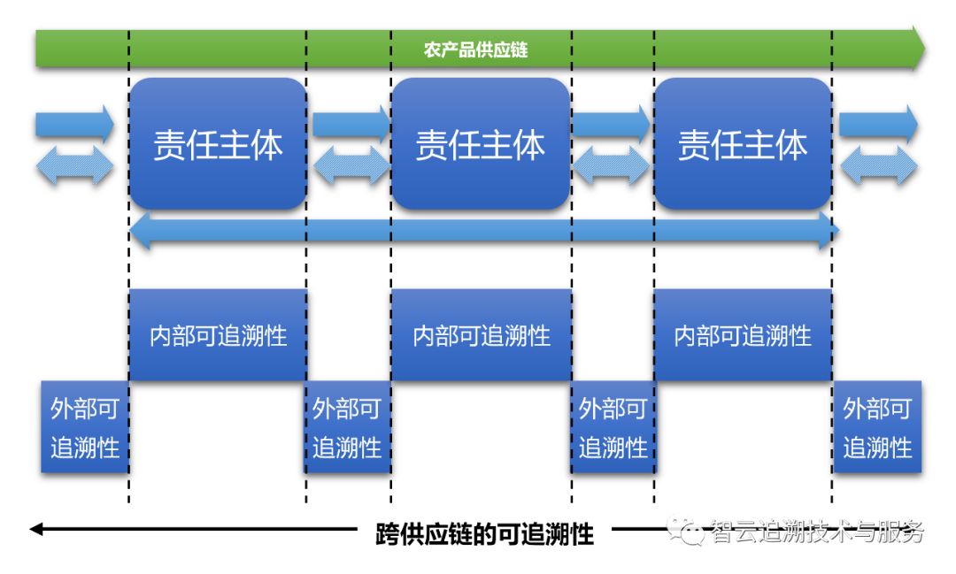 如果要更加深入地了解农产品质量安全追溯数据对接的实质,就必须要了解农产品内部追溯和外部追溯的关系。内部追溯是当前责任主体从收到其他责任主体的一个或多个可追溯农产品实体作为其内部生产/加工流程的输入,到该农产品实体转变为当前责任主体出产的农产品/加工/销售实体之间过程的跟踪与溯源。而外部追溯则是可追溯农产品实例从一个贸易伙伴(可追踪农产品来源)物理地移交给另一个(可追溯农产品收件人)的过程的跟踪和溯源[[1]]。只有将外部追溯和内部追溯关联起来,才能够实现真正的全过程追溯。因此,全过程追溯是覆盖整个供应链的、连接农产品生产经营主体内部生产/加工以及农产品在供应链中的流动,实现从农产品种/养殖环节到零售终端的正向跟踪,以及从零售终端到农产品种/养殖环节的反向溯源的过程。任何一个环节的缺失都会造成整个农产品追溯链条的断裂。