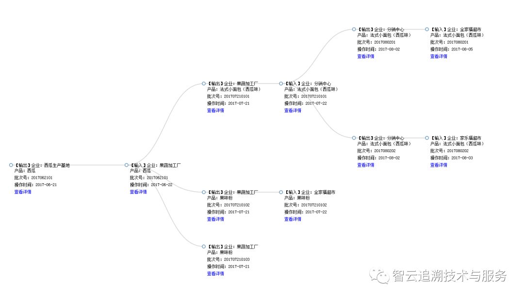数据上传同步完成,在中心端数据湖当中就有了农产品在供应链不同环节、不同责任主体间流动的追溯数据,就能够实现以全过程追溯为目的的追溯数据关联查询与分析了,也就是通常所讲的全过程追溯。