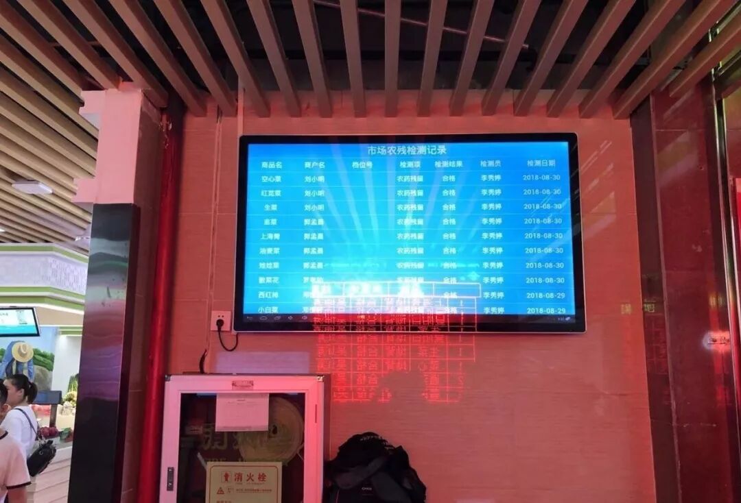 智慧农贸市场的食品安全检测、安全防控、安全追溯系统互为补充,交互作用。每天的菜品从生产基地、批发市场的采购信息,都会显示在墙上的检测中心电子屏中,同时对接食药监等部门检测数据,实现菜场内所有农产品有据可查,工作人员也会定期对市场内的菜品精心抽查检验。