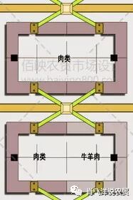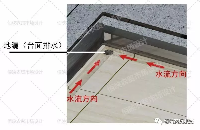 摊位内部地面的积水要限定在其范围内,不流到通道上,则需要在摊位内外的过道上设置物理隔离,如石材挡水条,或通过高差的形式来解决,并且在摊位内外过道上设置小集水井。(上图为摊位内外排水方案平面示意图)