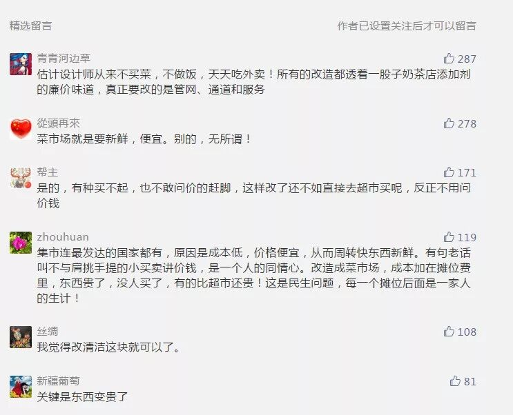 这篇文章引起了社会强烈的反响和广泛的共鸣,近十万的阅读量和源源不断的粉丝留言。从留言中看得出这些网红菜市场似乎并没有收得人心。