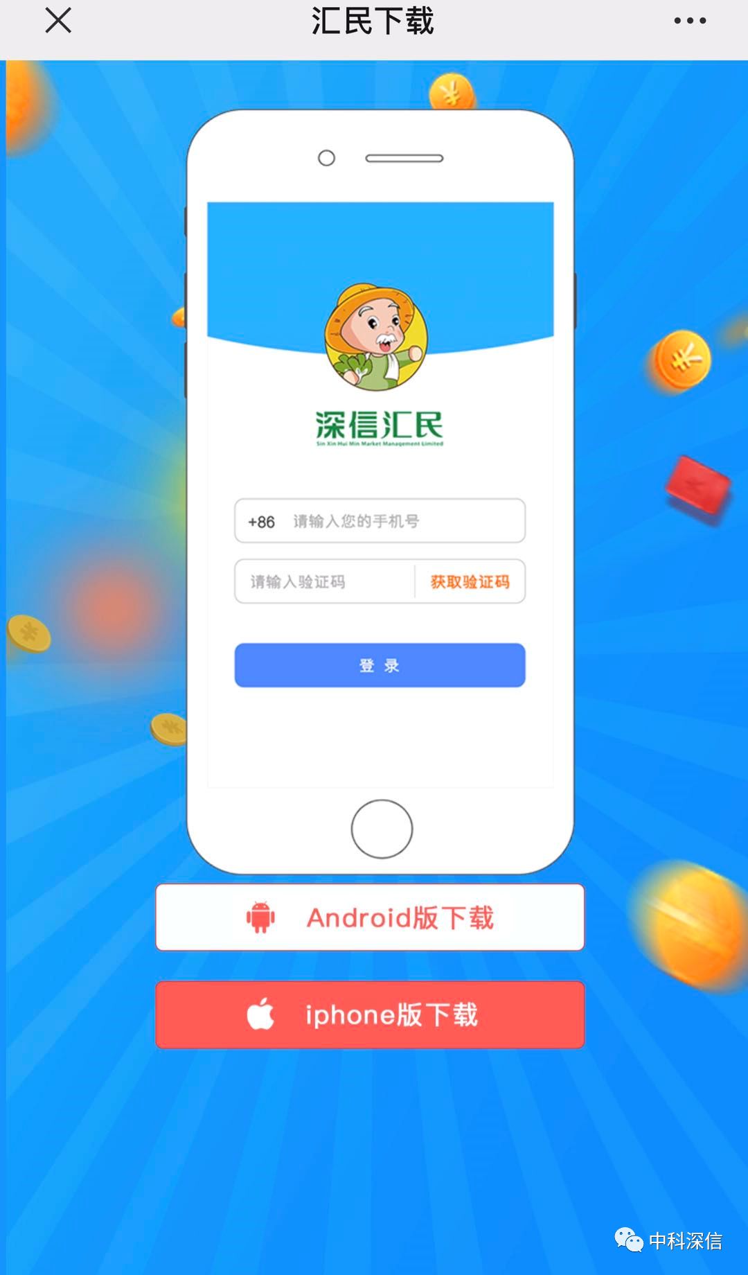 识别二维码下载 操作指南 请根据您手机的操作系统 选择不同版本的APP下载安装 微信直接识别二维码时 系统可能会提示您在浏览器中打开 按要求点微信右上角 选择在浏览器中打开即可下载安装 1 1、注册时选择市场所在地的城市,选择“对应的市场”,否则可能无法下单;2、不用设置密码,用注册好的手机号和手机验证码登录即可; 2 1、登录后点首页即可打开商品页面,根据自己的需要选择水果、蔬菜、粮油、调料、水产等品类。 3 1、下单时首先要添加收货地址,请务必写清楚详细地址;2、在留言里备注下具体要求,比如鳝鱼是否要杀等;3、支持微信及支付宝支付;4、体验完毕; 中科深信旗下的深信汇民APP是一款基于O2O的智慧农贸类互联网产品,是协助农贸商户提供便民服务的第三方信息展示平台,有IOS和安卓两个版本,已在各大应用市场上线。 用户通过该APP下单后,同时市场专业配送人员会免费送菜上门,核心区域提供8*7服务,服务范围内28分钟免费送到家。 我们与400家农贸市场及4万多家商户共同打造了“FSC(Factory Service Customer)买菜联盟服务工程”,联合传统农贸批发企业,整合行业资源,通过联盟成员批发商、零售商、基地等的集中采购,从产业链上游降低采购与物流成本,从而降低买菜价格,真正做到优质产品的直达,减轻百姓的经济负担,是连接用户与商家的纽带。 往期精彩内容推荐