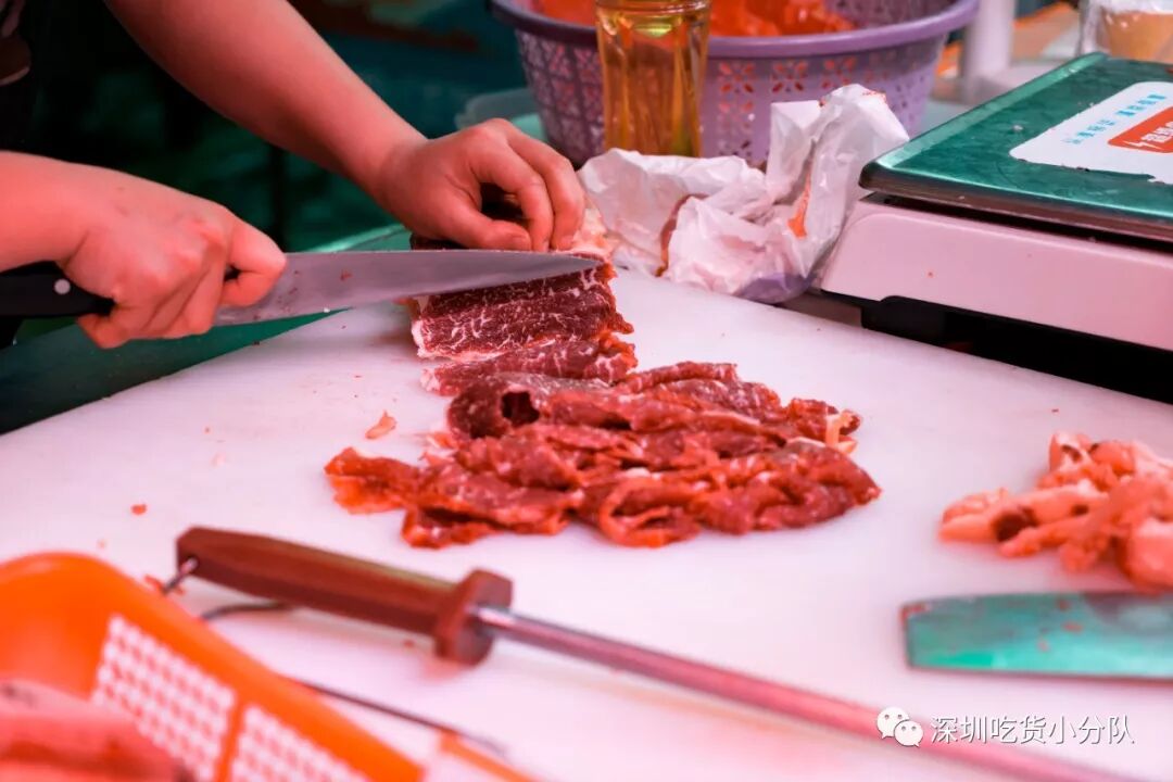 牛肉摊上的招牌写清楚了每天牛肉到店的时间,有煲汤的牛骨,自己打的牛丸,买了牛肉还可以帮你切片,瞧这牛肉的雪花,真美。