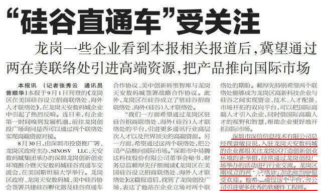 “我们一方面希望通过龙岗区驻硅谷招商联络处、海外(硅谷)人才联络处的平台,引进更多通讯行业高层次人才以及世界顶尖的高端资源。另一方面,希望通过这两个联络处,把公司产品推向国际市场。”深圳市中易腾达科技股份有限公司董事会秘书、财务总监赖厚先仔细阅读《龙岗区在美国硅谷设立招商联络处、海外人才联络处》这篇报道后,找到了龙岗创投广场,表达了他站在企业立场对两个联络处的期盼。赖厚先特别希望两个联络处能够成为龙岗区高新科技企业与硅谷之间实现资金、技术、人才配备、市场开拓的双向平台,可以把国际高端人才引入企业,同时借国际高端人才的视野和智慧,帮助企业更好地开拓国际市场。