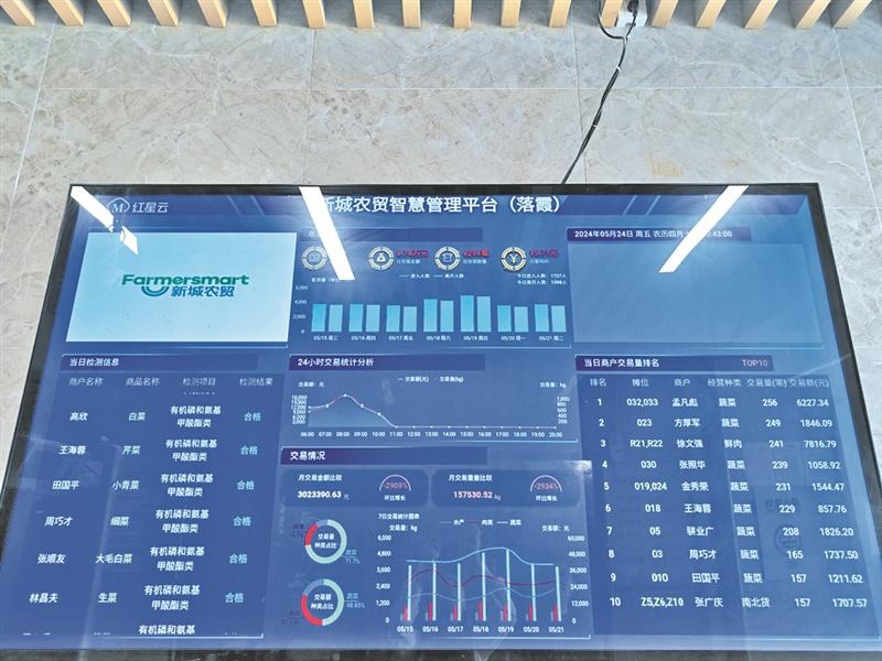 进入市场人数1727人、离开人数1598人,交易4294笔,日客单价15.71元……除了食品安全检测,农贸市场的日常运行管理装上“智慧大脑”,市场数据、交易金额等数据通过智慧管理平台便能实时掌握。“市场引入了智慧菜场管理系统,经营商家统一使用智能电子秤,交易数据、产品价格等成交数据实时传输给市场后台管理系统。”落霞农贸市场负责人华春红说,这样市民可以通过显示屏看到商户和菜价信息,交易公开透明,消费更放心,吃得更安心,市场管理方也能借助现代科技手段了解行情变动,提升管理水平。