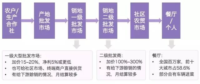 传统配送:夫妻店为主,自有货车,每天可服务7~8家餐厅,月毛利1~3万元,为餐厅提供赊销服务。