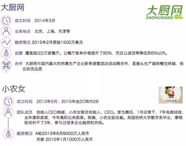现状特点B2B类食材供应平台主要针对下游餐厅提供配货服务,为多家餐厅集中采购来获得议价权,并提供物流服务,从而为下游降低成本。知名平台有美菜、链农、大厨网、小农女、优配良品、菜筐子、饭店联盟等,竞争非常激烈,刷单现象严重。